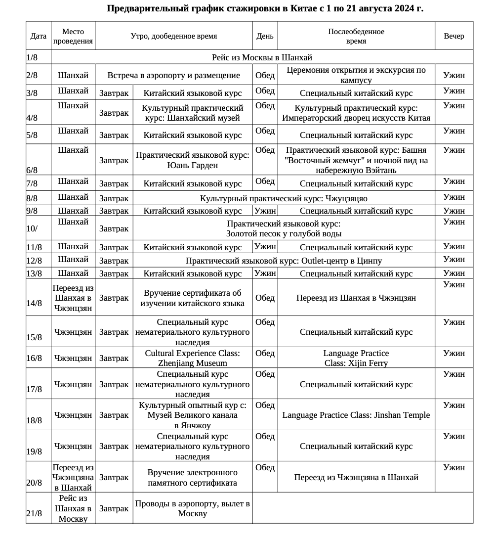 В рамках стажировки участникам предлагается богатая культурная программа, которая включает посещение знаменитых исторических и культурных достопримечательностей. Программа направлена на практическое погружение в китайскую культурную среду, что помогает глубже понять материал, изучаемый на курсах.