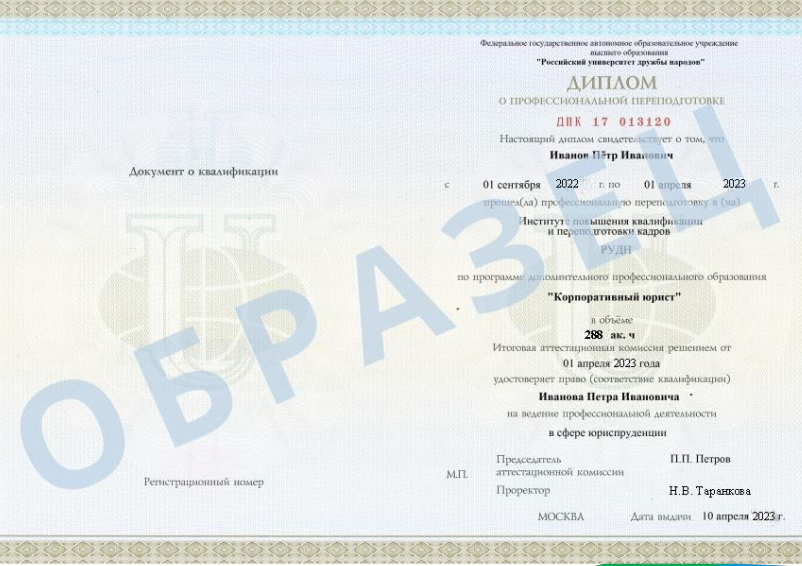 Данный диплом удостоверяет право ведения профессиональной деятельности: Корпоративный юрист. Выпускные документы изготавливаются до 30 дней после выхода приказа об успешном окончании обучения